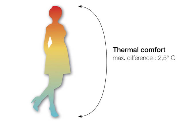A carpeted floor feels warmer underfoot and does not require the heating that a smooth surface may. Leading ergonomics experts and engineers have discovered that in order to feel comfortable, the difference in temperature between your head and feet should not exceed 2.5 °C. This heat difference almost never occurs with a quality wall-to-wall carpet, because of its excellent thermal insulation properties. As carpet removes cold at the level of your feet and ankles, you would even feel more comfortable in a carpeted room where the temperature is one or two degrees lower than in a room with a hard floor.